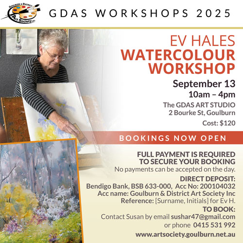 BENDIGO BANK BSB 633-000, ACCOUNT No 200104032, ACCOUNT NAME: Goulburn & District Art Society Inc, REFERENCE: [Surname, Initials] for [name of workshop tutor].